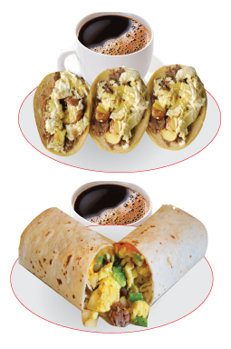 BREAKFAST $10.25 Served Daily 10:30am - 12:00pm Saturday & Sunday 11am-12pm Mix with your Choice of: Bacon, Potato or Mexican Sausage #1). 3 Egg & Cheese Tacos #2). 1 Egg &Cheese Burrito NOTE: Coffee not included with the special