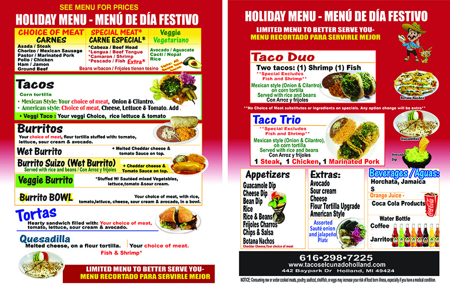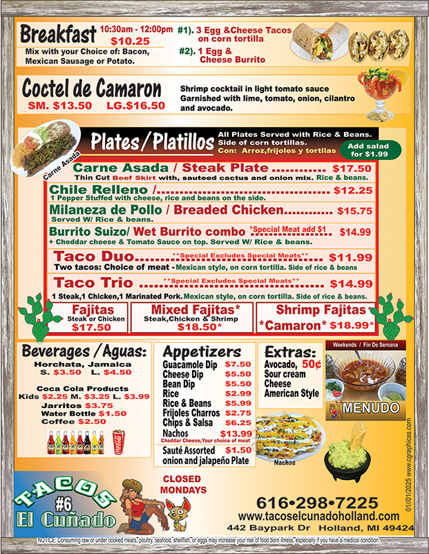 Tacos El Cuñado #6 442 Bay Park Drive Holland, MI 49424 We are located off Lakewood Blvd across from Northgate Appliance. Ph: 616•298•7225 -----Fx: 616•298•7226 |